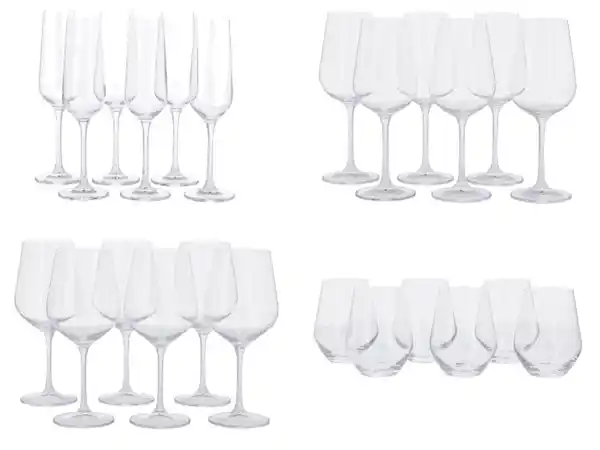 Nutzvolumen:Sektgläser: 215 ml; Weißweingläser: 410 ml; Rotweingläser: 630 ml; Wassergläser: 395 ml
