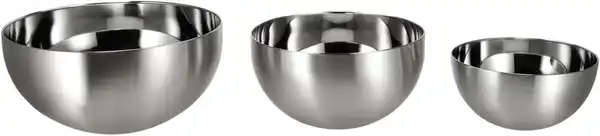 Aus Edelstahl > Außen mattiert, innen glänzend > Platzsparend ineinander stapelbar > Temperaturbeständig von -20 bis 200 °C > Spülmaschinengeeignet > Klein ca. Ø 19 x 9,3 cm (ca. 1.550 ml) > Mittel ca. Ø 24 x 12 cm (ca. 3.450 ml) > Groß ca. Ø 29 x 13 cm (ca. 5.200 ml)