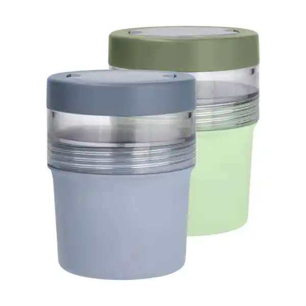 Aus Kunststoff > Perfekte Größe für unterwegs > Mit 2. Fach zum Aufbewahren von z. B. Müsli > Schraubdeckel mit auslaufsicherer Silikondichtun > Temperaturbeständig von 0 bis 60 °C > Spülmaschinengeeignet > Nutzvolumen ca. 600 und 200 ml > Größe ca. Ø 11 x 15 cm > Inkl. Klapplöffel (im Deckel verstaubar) > 3 Jahre Garantie