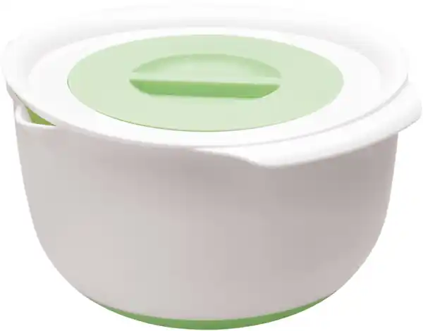 Aus Kunststoff > Mit rutschhemmendem Boden > Platzsparend ineinander verstaubar > Temperaturbeständig von -20 bis 80 °C > Spülmaschinengeeignet > Kleine Schüssel ca. Ø 16 x 10 cm (ca. 1,2 l) > Rührschüssel ca. Ø 25/28 x 14 cm (ca. 4,1 l) > Inkl. Deckel und Spritzschutzring > 3 Jahre Garantie