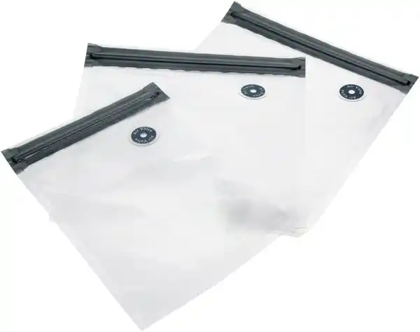 3 Größen à 5 Stück > mit Zip-Verschluss und Vakuumventil > Zum Sous-vide-Garen geeignet (max. 4 h) > Temperaturbeständig von -20 bis 100 °C > Fassungsvermögen ca. 800, 1.200 und 1.400 ml
