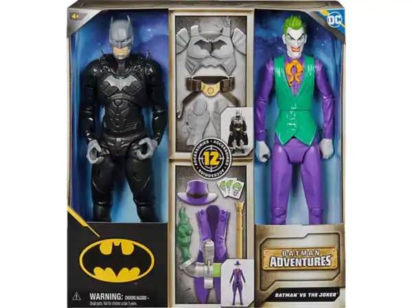 BAT Battle Pack Batman & Joker mit Clip Spannende Action im Doppelpack: Mit dem Batman Adventures Batman vs The Joker Action-Figuren Set kann der epische Kampf zwischen Gut und Böse gleich beginnen. Einfach aus den 12 enthaltenen Ausrüstungsgegenständen die für das jeweilige Abenteuer notwendigen Accessoires auswählen, Batman und Joker damit ausstaffieren und los geht's. Dank der 17 Artikulationspunkte können beide Action-Figuren coole Stunts hinlegen und die verschiedensten heldenhaften Posen einnehmen. Ihre detailgetreue Gestaltung im Comic-Look inspiriert dazu, die Abenteuer aus den Filmen nachzuspielen oder sich eigene Stories auszudenken. Hier ist dann die Fantasie gefragt. Wenn Kinder in die Rolle ihrer Helden schlüpfen, werden sie selbst zu Helden, gewinnen an Selbstvertrauen und lernen nebenbei etwas über Recht und Gerechtigkeit sowie Problemlösung. Mit anderen Produkten aus der Batman Adventures Linie von Spin Master wie dem 2-in-1 Batcyle, das sich vom Motorrad in einen Gleiter verwandelt, oder der einzelnen 30 cm Batman Figur mit 16 Zubehörteilen lässt sich die Welt von Gotham City weiter ausbauen und eröffnet neue fantasievolle Spielmöglichkeiten. Inhalt: 2 Action-Figuren 30 cm 12 Zubehörteile