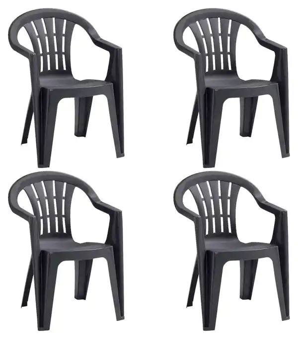 Genießen Sie den Sommer auf diesem stapelbaren und grauen SIENA GARDEN Gartensessel in vollen Zügen. Das robuste Kunststoff-Gestell hält bis zu 110 kg stand, sodass es sich Groß und Klein darauf bequem machen. Des Weiteren ist das ca. 58 x 79 x 56 cm (B x H x T) große Möbel so gebaut, dass Sie ausreichend Platz zum Relaxen haben. Besonders praktisch: Das Set kommt mit 4 Komponenten, damit auch die Liebsten eine Sitzmöglichkeit fürs behagliche Beisammensein erhalten. Schließlich zeigt sich das UV- und kältebeständige Ensemble als beständiger Allrounder für das ganze Jahr. Auf diesem Gartensessel in Graphitfarben (stapelbar) erholen Sie sich vom Alltag. ACHTUNG: Lieferung frei Bordsteinkante.