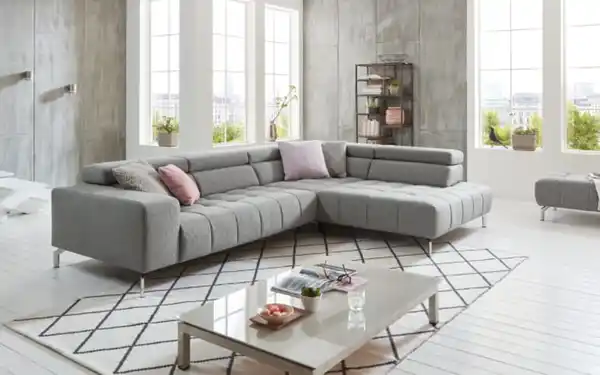 Moderne Wohnlandschaft mit Stoffbezug Salsa in Grau, dauerelastische Wellenfedern mit hochwertiger Kaltschaum Polsterung, Sitzfläche mit Steppung,