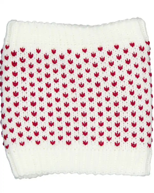 Dieser weiße Schal hat ein gestricktes Muster mit kleinen roten Herzen. Der weiche Stoff fühlt sich angenehm auf der Haut an und hält dich an kalten Tagen gut warm. Der Schal passt gut zu einem winterlichen Outfit und sorgt für zusätzlichen Komfort, wenn es draußen kälter wird.