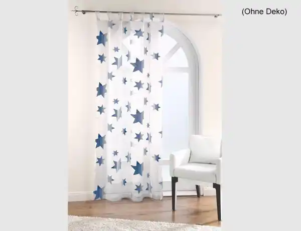 Das Grundgewebe ist ein sogenannter Voile. Dieser zeichnet sich durch seine hohe Lichtdurchlässigkeit aus. Diese Transparenz hat den Vorteil, dass Tageslicht wunderbar in Ihre Wohnräume gelangen kann und diese mit Licht durchfluten. Das Ergebnis ist ein heller und freundlicher Wohnbereich. Der Schlaufenschal Sterne lässt sich wunderbar mit anderen Einrichtungsgegenständen in den Farbwelten Weiß und Blau kombinieren