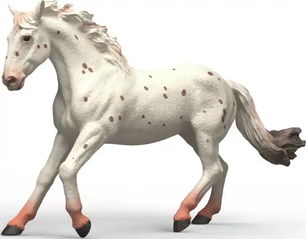 Die elegante Knabstrupper Stute hat weißes Fell mit braunen Tupfen. Auch ihre Mähne und ihr Schweif sind weiß mit ein paar braunen Strähnen darin. Die hübsche Fellzeichnung kommt besonders gut zur Geltung, wenn sie wie jetzt dynamisch über die Weide galoppiert. Was für ein Anblick!