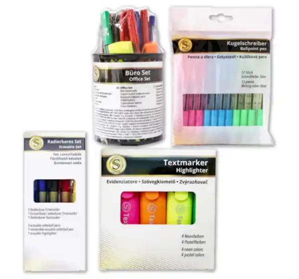 - 20-teiliges Office-Set, bestehend aus: 5 Druckkugelschreiber, 8 Kugelschreiber mit Kappe, 2 Textmarker, 3 Duo-Fineliner, 1 Permanent Marker und 1 Köcher, je Set 4.99