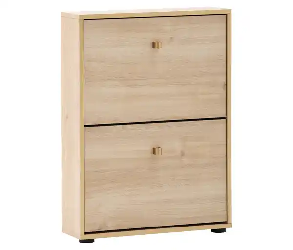 Schuhkipper »Flora«, 2 Klappen Farbe: Weißeichen-Dekor Kante und Griffe goldfarben Füße schwarz Material: Melaminharzbeschichtete Spanplatte Griffe und Beschläge Metall Füße Kunststoff Maße: B x H x T ca. 59,8 x 83,2 x 19,5 cm B x H x T Griffe ca. 2,6 x 3 x 2,5 cm Höhe Füße ca. 1,9–2,7 cm Inhalt: Inkl. Montageanleitung Gewicht: Ca. 16,5 kg Gebrauchsanweisung: Mit einem feuchten, nicht nassen Tuch reinigen Pflegeprodukte sind nicht notwendig Warnhinweise: Beiliegende Montageanleitung vollständig beachten Sonstige Hinweise: Artikel wird zerlegt geliefert Lieferung in 1 Packstück Anlieferung frei Haus Keine Inselbelieferung B x H x T Packstück ca. 40,5 x 9,5 x 128 cm Platzsparend durch geringe Tiefe2 Klappen mit 1-reihigen SchuhtrommelnPlatz für ca. 6 Paar Schuhe bis Schuhgröße 44/45, Schuhlänge ca. 33 cmGoldfarbene KantePlatzsparend durch geringe TiefeKlappenbeschlag mit Einrastung zum sicheren Öffnen und SchließenWeißeichen-Dekor mit fühlbarer HolzstrukturFüße höhenverstellbar um Unebenheiten im Boden auszugleichenWandbefestigung erforderlichEinfache Montage mit verständlicher AufbauanleitungMADE IN GERMANY