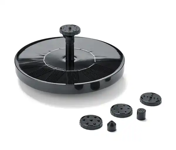 Schwimmender Solar-Springbrunnen Farbe: Schwarz Material: Kunststoff Maße: Höhe ca. 5 cm Ø ca. 16 cm Inhalt: Inkl. Bedienungsanleitung Leistung: 2 W, 7 V Energieeffizienz-Angaben: Informationen zur Entsorgung sowie Sammelstellen in Ihrer Nähe finden Sie auf www.tchibo.de Gebrauchsanweisung: Direkte Sonneneinstrahlung zur optimalen Wasserförderung nötig Solarfontäne mit 2-Watt-Solarpanel und leistungsstarker 1-Watt-Pumpe Wasserspiel für den Brunnen oder Gartenteich zu HauseHöhe der Fontäne bis zu 55 cmVerschiedene Wassersprüh-Effekte durch 6 unterschiedliche SprühköpfeAutomatisches Einschalten bei Sonnenlicht – Wasserförderung abhängig von der SonnenintensitätBenötigt direkte Sonneneinstrahlung zur optimalen WasserförderungSolarpanel direkt auf Brunnen-Oberfläche integriert
