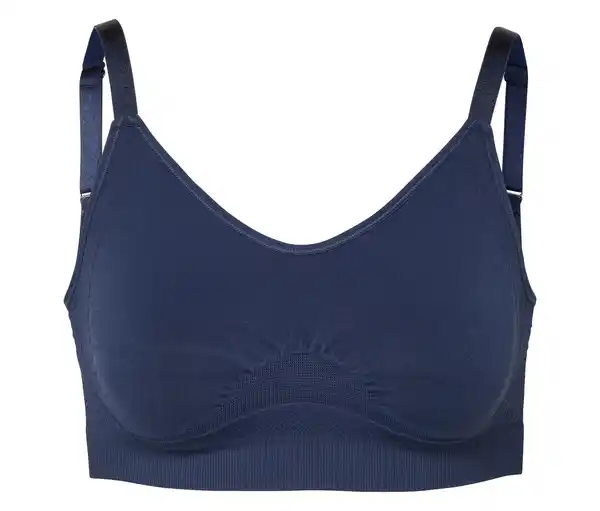 Seamless-Sport-BH, dunkelblau Farbe: Dunkelblau Material: 90% Polyamid, 10% Elasthan (Creora®) Passform: Leichter Halt Atmungsaktiv, feuchtigkeitstransportierend und schnelltrocknend durch DryActive Plus-Ausrüstung Seamless: nahtlose Verarbeitung – liegt angenehm auf der HautOptimaler Halt durch unterschiedliche Strickzonen und breites UnterbrustgummiMit Markenelasthan: formbeständig, perfekter Sitz bei voller Bewegungsfreiheit3-fach verstellbarer SoftSeal®-Häkchenverschluss, Verschlussbreite proportional an Cup-Größe angepasstKeine Seitennähte ‒ hoher TragekomfortLängenverstellbare TrägerWeich angeraute Innenseite