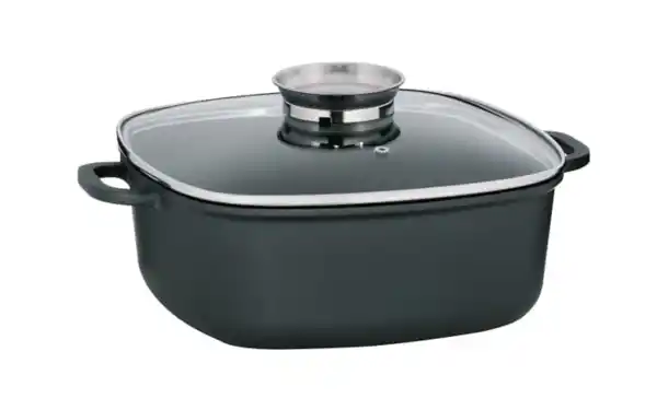 Servierpfanne aus Aluguss (GREBLON®-C3-Beschichtung) in schwarz mit feuerfestem Glasdeckel mit Aromaknopf zum langsamen Aromatisieren von Speisen zum Beispiel mit Wein, geeignet für alle Herdarten (auch Induktion), backofenfest bis 180° C, Fassungsvermögen ca. 6 l. L/B/H ca. 28 x 28 x 11 cm.