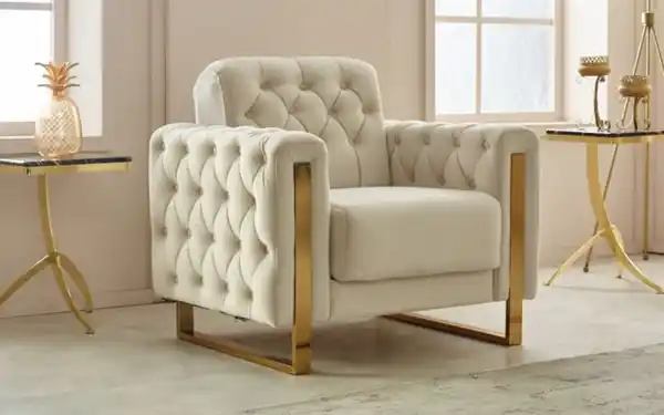 Ausführung mit weichem Stoffbezug Soft in Creme, komfortable Federkern Polsterung, formschöne goldfarbige Metallfüße,