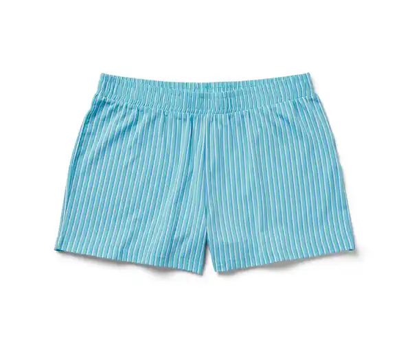Shorts, gestreift Farbe: Türkis-blau-weiß gestreift Material: 48% Baumwolle (Unterstützt die Initiative Cotton made in Africa), 47% Modal, 5% Elasthan Passform: Regular Fit Leichtes Material aus Baumwolle und ModalElastischer BundMit hochwertigem Markenelasthan für Langlebigkeit und hohe WaschbeständigkeitDiese Shorts unterstützen die Farmer*innen.