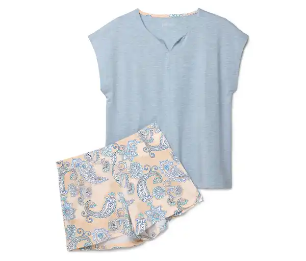Shorty-Pyjama-Set Farbe: Oberteil hellblau meliert Shorts creme mit blauem Paisley-Alloverprint Material: 58% Baumwolle, 39% Viskose, 3% Elasthan Maße: Oberteil Gesamtlänge länge ca. 64 cm (Gr. M 40/42) Damenschlafanzug in weicher Viskose-Mischqualität Oberteil mit V-AusschnittShorts mit elastischem BundMit hochwertigem Markenelasthan für Langlebigkeit und hohe Waschbeständigkeit