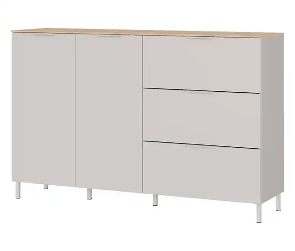 Sideboard »Savoca«, Kaschmir/Eiche Farbe: Kaschmir/Lindberg-Eiche-Nachbildung Material: Melaminharzbeschichtete Spanplatte. Füße Metall Maße: B x H x T ca. 151 x 98 x 40 cm Inhalt: Inkl. Montageanleitung Gewicht: Gewicht ca. 60,4 kg Tragkraft: Tragkraft Oberboden max. 30 kg. Einlegeböden und Schubladen je max. 10 kg. Unterboden max. 15 kg Gebrauchsanweisung: Keine alkoholhaltigen Mittel, Schleifmittel oder statisch aufgeladenen Staubreiniger verwenden Mit einem trockenen Tuch wischen Montage unter Berücksichtigung der Angaben in der Aufbauanleitung Sonstige Hinweise: Artikel wird zerlegt geliefert. Lieferung in 2 Packstücken. Anlieferung frei Verwendungsstelle. Keine Inselbelieferung. B x H x T Packstücke 1x ca. 44,1 x 11,3 x 165,5 cm, 1x ca. 43,2 x 16,5 x 101,6 cm. Gewicht Packstücke 1x ca. 30,2 kg, 1x ca. 30,2 kg 3 Schubladen und 2 TürenMit verstellbaren EinlegebödenKratzfeste und widerstandsfähige OberflächenbeschichtungStoß- und schlagfeste KantenMit Tür- und SchubladendämpfungFüße und Griffe aus MetallKaschmir/Lindberg-Eiche-NachbildungMADE IN GERMANY