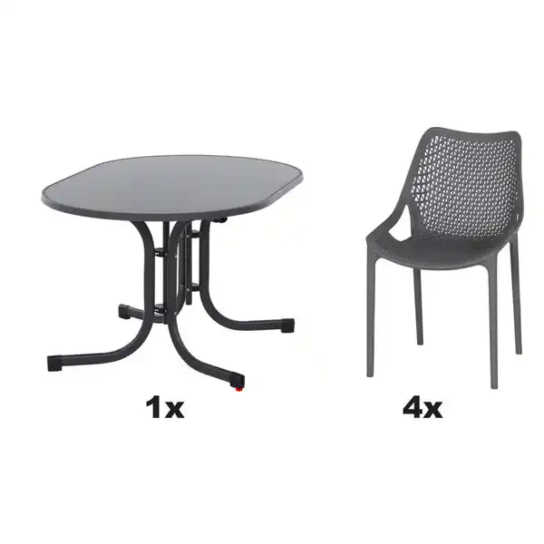 Diese 5-teilige Gartengarnitur von Siena Garden spricht alle an, die den eigenen Außenbereich mit passenden Gartenmöbeln zu einem zeitgemäß gestalteten Wohlfühl-Areal für 4 Personen machen möchten. Wissenswertes zum Tisch: Maße: ca. 90x138 cm (BxT) Form: oval Höhe: ca. 71 cm Belastbarkeit: maximal ca. 15 kg Farbe: Anthrazit Platte: Melaminbeschichtung Gestell: Metall Der Gartentisch verfügt über eine Tischplatte mit Melaminbeschichtung, die sehr strapazierfähig ist. Sein Gestell besteht aus pulverbeschichtetem Stahl und erweist sich folglich ebenfalls als robust. Praktisch: Es handelt sich um einen Klapptisch, der sich bei Bedarf platzsparend verstauen lässt. Das gestattet Ihnen viel Flexibilität hinsichtlich der Nutzung Ihres Freiluft-Idylls. Details zu den 4 Stühlen: Farbe: Grau Stuhlmaße: ca. 60x81x50 cm (BxHxT) Sitzfläche: ca. 49x44 cm (BxT) Sitzhöhe: ca. 43,5 cm Belastbarkeit: maximal ca. 150 kg Material: Kunststoff Die 4 Stapelstühle mit niedrigen Armlehnen setzen auf ein klar definiertes Trend-Design, das immer angesagt bleibt. Dabei gibt das Rautenmuster der Rückenlehne und der Sitzfläche dem puristischen Look Struktur. Für die dauerhafte Stabilität der Niedriglehner aus robustem Polypropylen wurden deren 4-beinige Gestelle glasfaserverstärkt. Wenn Sie gerade nicht im Freien zusammensitzen wollen, können Sie die Gartenstühle stapeln und gewinnen so Fläche für andere Tä
