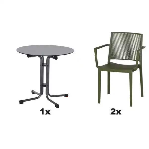Diese 3-teilige Gartengarnitur von Siena Garden spricht alle an, die den eigenen Außenbereich mit passenden Gartenmöbeln zu einem zeitgemäß gestalteten Wohlfühl-Areal für 2 Personen machen möchten. Wissenswertes zum Tisch: Durchmesser: ca. 80 cm Form: rund Höhe: ca. 71 cm Belastbarkeit: maximal ca. 15 kg Farbe: Anthrazit Platte: High-Pressure-Laminat Gestell: Metall Der Gartentisch verfügt über eine langlebige HPL-Tischplatte, die kratzresistent ist und sogar größere Temperaturschwankungen verträgt. Sein Gestell besteht aus pulverbeschichtetem Stahl und erweist sich folglich ebenfalls als robust. Praktisch: Es handelt sich um einen Klapptisch, der sich bei Bedarf platzsparend verstauen lässt. Das gestattet Ihnen viel Flexibilität hinsichtlich der Nutzung Ihres Freiluft-Idylls. Details zu den 2 Stühlen: Farbe: Grün Stuhlmaße: ca. 57x80x56 cm (BxHxT) Sitzfläche: ca. 42,5x44 cm (BxT) Sitzhöhe: ca. 45 cm Belastbarkeit: maximal ca. 150 kg Material: Kunststoff Die 2 Stapelstühle in Grün setzen auf ein klar definiertes Trend-Design, das immer angesagt bleibt. Dabei gibt das Gittermuster der Rückenlehne, die wie die geschlossene Sitzfläche aus unbehandeltem Polypropylen besteht, dem puristischen Look Struktur. Für die dauerhafte Stabilität der Niedriglehner mit Armlehnen aus robustem Polypropylen wurden deren 4-beinige Gestelle glasfaserverstärkt. Wenn Sie gerade nicht im Freien zusammensi