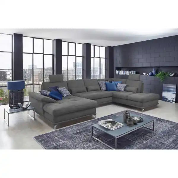 Diese SIT & More Wohnlandschaft in Grau stellt sich stilsicher in den Dienst Ihrer Relaxoase. Das Wichtigste auf einen Blick: U-Form: ca. 176 x 363 x 223 cm (Schenkelmaße) Draufsicht davorstehend: Ottomane rechts Höhe: ca. 89 cm Anzahl der Sitzplätze: ca. 7 Sitzfläche: ca. 288 x 53 cm (B x T), Sitzhöhe: ca. 47 cm maximale Belastbarkeit: ca. 770 kg maximale Belastbarkeit pro Sitz: ca. 110 kg Liegefläche der Bettfunktion: ca. 133 x 288 cm (B x L), Liegehöhe: ca. 47 cm Armlehnen: ca. 35 x 62 cm (B x H) Fußhöhe: ca. 12 cm Erlebbare Gemütlichkeit Der verwendete Mischgewebe-Stoff (ca. 90 % Polyester & 10 % Polyamid) mit Flachgewebe-Oberfläche ist beständig und fühlt sich weich an. Zudem überzeugt der Bezug mit einer nicht vorhandenen Pillingbildung sowie einer guten Abriebfestigkeit. Eine bequeme, luftdurchlässige Federkern-Polsterung mit Wellenunterfederung, die zu tiefes Einsinken verhindert, unterstützt den Körper und ruft Komfort hervor. Als Ausstattungs-Extra sind überdies gleich mehrere Zusatzoptionen inklusive: Profitieren Sie von einer Kopfstütze sowie einer Sitztiefenverstellung – damit erleben Sie maßgeschneiderte Regenerationsbedingungen. Wenn Übernachtungsbesuch erwartet wird, kommt die Schlaffunktion ins Spiel und das Sofa wird in kürzester Zeit zum Gästebett. Benötigte Heimtextilien lassen sich im praktischen Bettkasten bereitlegen. Absolut sehenswert Ein Eyecatcher in verschiedenen Einrichtungskonzepten ist die zurückgenommene Farbgebung in Grau. Mit den hohen Winkelfüßen aus satiniertem Nickel in Silberfarben ist ein stabiler Stand gegeben und das Design wird stimmig komplettiert.
