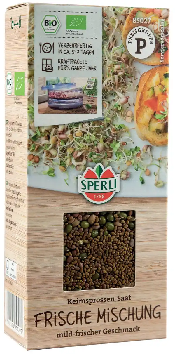 Die Frische Mischung ist mit ihrem milden - frischen Geschmack ein Highlight in jedem Salat. Wir empfehlen Dir die Kultur in der SPERLI Sprossenbox. Bereits nach 4 - 6 Tagen sind die Sprossen erntereif. Anwendung: Das Gefäß an einen hellen Ort ohne direkte Sonneneinstrahlung stellen. Bis zur Ernte täglich 2 - bis 3 - Mal spülen. Tipps: Keimsaat eine Nacht in Wasser vorquellen. Verzehrfertige Sprossen sind im Kühlschrank einige Tage haltbar. Sie sollten vor dem Verzehr nochmals gespült werden. Inhalt: 30 % Alfalfa, 10 % Linsen braun, 10 % Linsen rot, 40 % Mungbohnen, 10 % Rettich.Pflanzzeit Direktsamen: Januar, Februar, März, April, Mai, Juni, Juli, August, September, Oktober, November, DezemberStandort: halbschattigErntezeit: Januar, Februar, März, April, Mai, Juni, Juli, August, September, Oktober, November, DezemberZum Verzehr geeignetKeimdauer: 3 - 5 Tageoptimale Keimtemperatur: 18°C - 22°Choher Ertrag (F1):