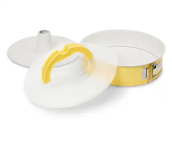 Springform mit Transportdeckel Farbe: Gelb, innen weiß Deckel semitransparent Material: Backform Stahlblech, außen antihaftbeschichtet mit GREBLON® Q-LINE B1000 Deckel Polypropylen Verschluss Edelstahl 18/10 Maße: Höhe ca. 6,8 cm Ø ca. 26 cm Inhalt: Inkl. Wechselboden und Gebrauchsanweisung, 2 Rezeptvorschläge online abrufbar Gewicht: Form ca. 400 g Deckel ca. 150 g Füllmenge: Ca. 2,7 l Warnhinweise: Deckel nicht backofengeeignet 3 in 1: Backform, Transport- und AufbewahrungsboxMit 2 Böden: für normalen Kuchen oder GugelhupfKomplett ohne PFAS-Rohstoffe hergestellte Qualitäts-Antihaftbeschichtung GREBLON® Q-LINE B1000: vermindert das Festsetzen von Teig, einfach zu reinigenDeckel mit Tragegriffen2 Rezeptvorschläge online abrufbar