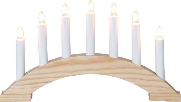 Der Kerzenhalter BEA besteht aus naturfarbenem Holz in Brückenform, auf dem sieben weiße Kunststoff-Kerzen angeordnet sind. Die Kerzen erstrahlen in einem angenehmen warmweißen Licht und stimmen so auf die festliche Weihnachtszeit ein. Mit einer Kabellänge