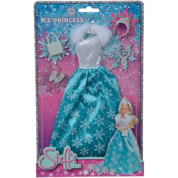 Wunderschönes Eisprinzessinnenkleid mit Glitzerbesatz für Steffi Love oder andere Modepuppen (29 cm). Inkl. Stola, Handtasche, Schuhe, Halskette und Diadem. Ab 3 Jahren.