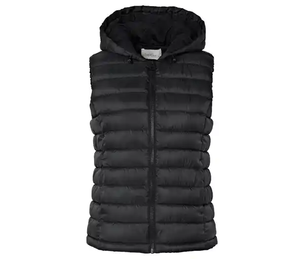 Steppweste mit Kapuze, schwarz Farbe: Schwarz Material: 100% Polyester Maße: Gesamtlänge ca. 63,5 cm (Gr. 40) Passform: Regular Fit Leichte, wärmende WattierungKapuze mit Tunnelzug und StopperEingrifftaschen mit DruckknopfVorderseite mit ReißverschlussArmloch mit elastischem Einsatz für optimalen TragekomfortWiener Nähte für eine feminine Silhouette