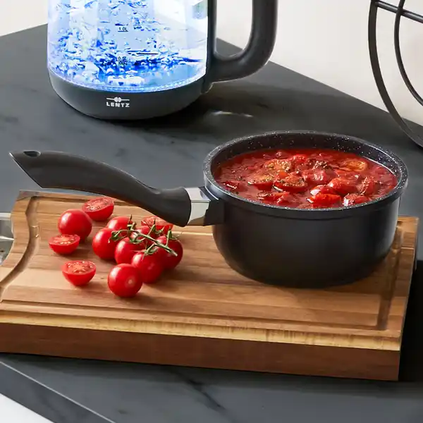 Klein, aber fein: Diese schöne Stielkasserolle eignet sich hervorragend für leckere Saucen oder zum Erwärmen von einer kleinen Portion Suppe. Der lange, isolierte Stiel garantiert Ihnen eine einfache Handhabung. Dieses wundervolle Basic werden Sie in Ihrer Küche nicht mehr missen wollen. Aluguss mit Ilag-Keramik-Antihaftbeschichtung starker Induktionsboden, dadurch optimale Wärmeverteilung ø ca. 16 cm, Höhe ca. 8 cm