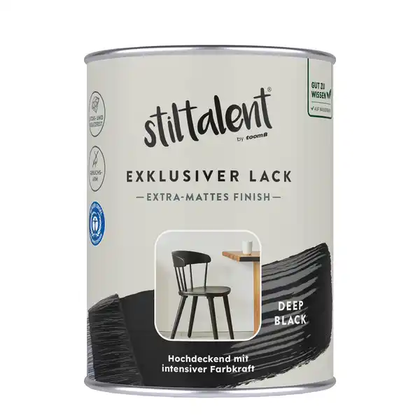 extreme Deckkraft, exzellentes Oberflächenfinish, stoß- und kratzfest, schnell trocknend, für Kinderspielzeug geeignet; Der exklusive Lack für hochwertige, extra-matte Neu- und Renovierungsanstriche auf verschiedenen Untergründen und eine charaktervolle Gestaltung deines Zuhauses. Geeignet für Untergründe aus Holz, Metall oder (lackierbarem) Kunststoff im Innen- und Außenbereich (zum Beispiel Stühle, Tische, Tore und Zäune). Untergründe müssen tragfähig, sauber, trocken, wachs-, rost- und fettfrei sein. Gut erhaltene Altanstriche anschleifen. Lose Teile sowie Rost entfernen und mit toom Metall-Grundierung grundieren. Kunststoffe mit toom Kunststoff-Grundierung, alle anderen Untergründe mit toom Universal-Haftgrund vorbehandeln. Abblätternde und spröde Altanstriche mit Abbeizer restlos entfernen.