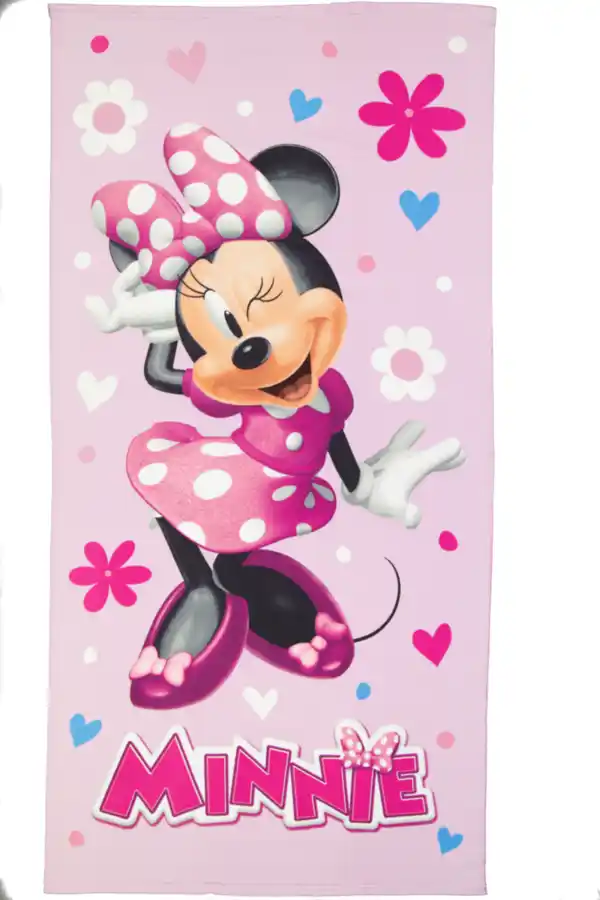 Dieses rosafarbene Strandtuch hat einen auffälligen Minnie Mouse-Print mit weißen Punkten, Blumen und Herzen. Durch die fröhlichen Farben und das große Motiv ist das Strandtuch ideal für den Strand oder das Schwimmbad. Das große Format sorgt dafür, dass du dich bequem darauf legen oder nach dem Schwimmen damit abtrocknen kannst.