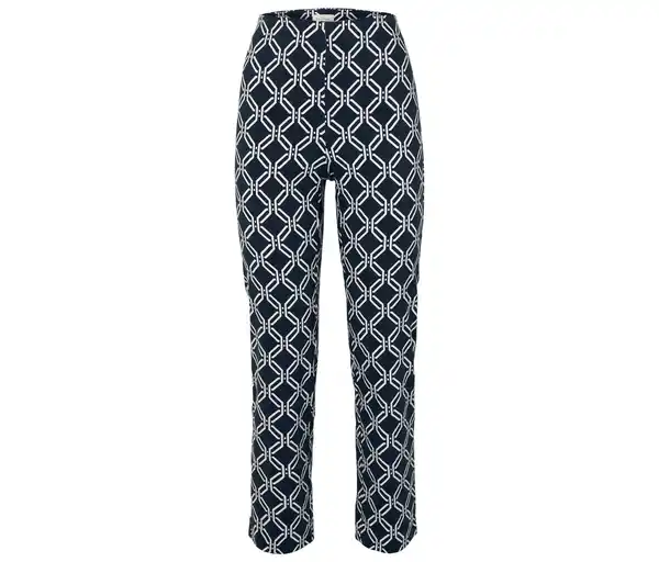 Stretchhose, dunkelblau mit weißem Alloverprint Farbe: Dunkelblau mit weißem Alloverprint Material: 77% Viskose, 20% Polyamid, 3% Elasthan (Creora®) Maße: Innenbeinlänge ca. 73 cm Passform: Skinny Fit Elastische Qualität mit ViskoseGerades BeinElastischer Bund – kein EinschnürenKnöchellangMit Elasthan: formbeständig, perfekter Sitz, hoher Tragekomfort