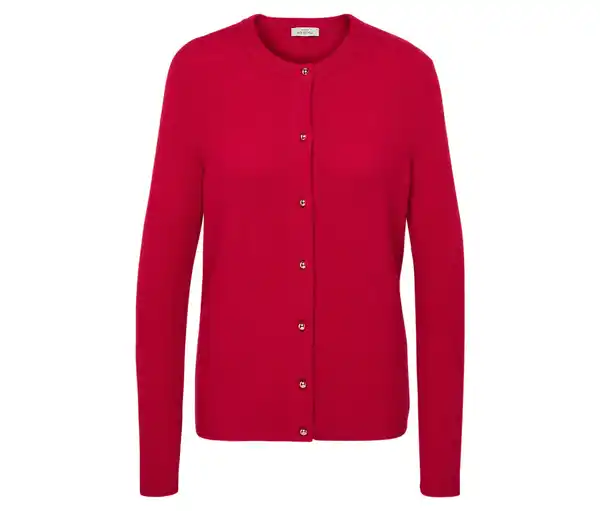 Strickcardigan mit goldfarbenen Knöpfen Farbe: Rot Material: 35% Polyester, 31% Wolle, 15% Polyamid, 15% Polyacryl, 4% Elasthan Maße: Gesamtlänge ca. 64 cm (Gr. M 40/42) Passform: Regular Fit Weiche und wärmende Qualität mit WolleElastische Rippbündchen an Ausschnitt, Ärmelabschluss und SaumVorderseite mit KnopfleisteHochwertige Metallknöpfe in goldglänzender OptikRundhalsausschnittLeicht überschnittene Schultern Mit Elasthan: formbeständig, perfekter Sitz, hoher TragekomfortDiese Strickjacke beinhaltet 31% RWS-zertifizierte Wolle, zertifiziert durch CU 809415