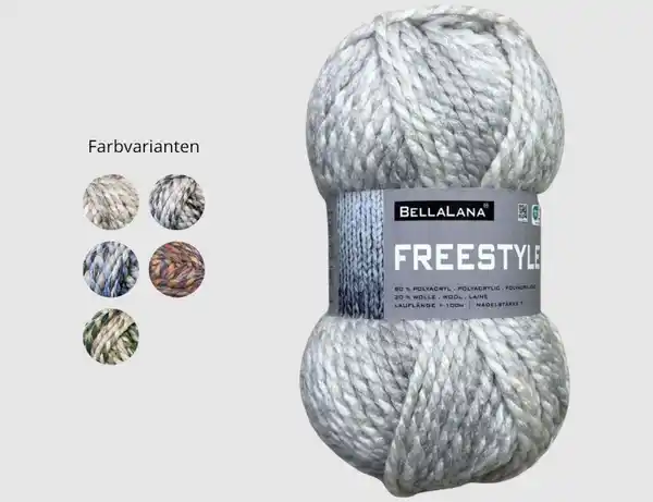 Mit einer Lauflänge von etwa 100 Metern pro Knäuel bietet das Garn eine solide Grundlage für kleinere bis mittlere Strickideen. Ob Mützen, Schals, Loops, grob gestrickte Pullover oder dekorative Wohnaccessoires wie Kissen oder Deckenakzente, Freestyle eröffnet vielfältige Einsatzmöglichkeiten und passt sich unterschiedlichen Stilrichtungen an. Die strukturbetonte Optik sorgt dafür, dass Strickstücke auch ohne komplexe Muster lebendig wirken.