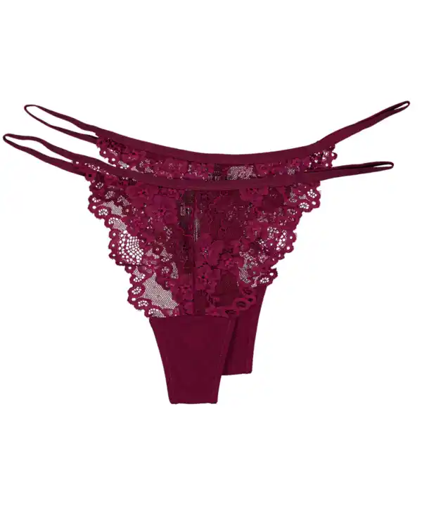 Dieses Set enthält zwei bordeauxrote Damenstrings aus Spitze. Sie bestehen aus 90 % Polyamid und 10 % Elasthan. Die Spitze verleiht den Strings einen luxuriösen Look. Dank der dünnen Bändchen fühlen sich die Strings leicht und bequem an. Angenehm unter verschiedenerlei Kleidung zu tragen.