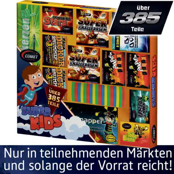 Jugendfeuerwerk mit über 385 Teilen. Mit super Knallerbsen, Knisterartikeln, Bodenwirbeln und strahlenden Wunderkerzen. Ab 12 Jahren. Je Set (Alle Angaben ohne Gewähr. Effekte ähnlich. Feuerwerk der KAT F1 wird an Personen ab 12 Jahren verkauft. Angebot gültig bis 31.12.2024, KW1)