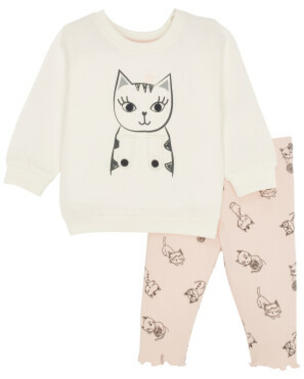 Sweatshirt: Katzenprint mit Glitzerdetails Bewegliche Pfoten-Applikation mit Klettverschluss Rundhalsausschnitt Schulterknöpfung Rippbündchen an Saum und Armabschlüssen Gerader Saum Leggings: gerippter Stoff Komplett mit Katzen bedruckt Elastischer Bund Lettuce-Kante an den Beinabschlüssen Schmale Passform Normale Beinlänge Produktnummer 1175126 Material Sweatshirt: 100 % Baumwolle Leggings: 95 % Baumwolle, 5 % Elasthan