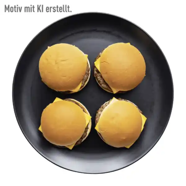 Burger-Brötchen mit Rindfleischfrikadelle; gegart, mit Käse- und Gurkenscheiben; zum erneuten Erhitzen