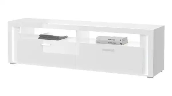 Das TV-Lowboard SKYLIGHT in weiß Hochglanz ist mehr als nur ein Möbelstück - sie ist ein stilvolles Statement für modernes Wohnen. Mit seinem klaren, angesagten Design bringt es Eleganz und Leichtigkeit in jeden Raum und setzt Ihre Lieblingsstücke gekonnt in Szene. Die integrierte vertikale Frontbeleuchtung verleiht dem Lowboard eine besondere Ausstrahlung: Sanftes Licht hebt dekorative Elemente hervor und schafft eine warme, einladende Atmosphäre. Ein echtes Highlight sind die wellenförmigen Design-Details in der Front, die dem Möbel eine dynamische, fast lebendige Struktur verleihen. So entsteht ein spannendes Zusammenspiel aus Licht, Form und Oberfläche, das sofort ins Auge fällt.Mit einer Breite von ca. 201 cm bietet das Lowboard großzügigen Platz für Ihren Fernseher sowie all Ihre Entertainment-Geräte. Die 2 offenen Gerätefächer sind ideal für Receiver, Konsole oder Soundbar und sorgen dafür, dass alles griffbereit und gleichzeitig ordentlich verstaut ist. Hinter den 2 Türklappen verbirgt sich zusätzlicher Stauraum für Zubehör, Kabel oder persönliche Dinge, die Sie gerne außer Sicht aufbewahren möchten. So bleibt Ihr Wohnbereich stets aufgeräumt und harmonisch. Eine Soft-Close-Funktion sorgt für ein leises, sanftes Schließen der Türen. Unser TV-Lowboard SKYLIGHT verbindet modernes Design mit durchdachter Funktionalität - für ein Zuhause, das nicht nur schön aussieht, sondern sich auch genauso anfühlt. Lassen Sie Ihr Wohnkonzept im besten Licht erstrahlen.Bestellen Sie noch heute Ihr neues Lowboard SKYLIGHT bequem über unseren Onlineshop. Wir freuen uns auf Sie!