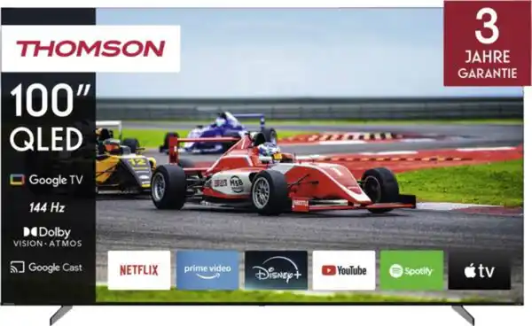 253 cm LED-Fernseher, 100 Zoll, Auflösung: 3.840x2.160 Pixel, 4K Ultra HD, H.265 HEVC, QLED-Technologie, High Dynamic Range (HDR 10), Dolby Vision, DVB-T, DVB-T2, DVB-T2 HD, DVB-S, DVB-S2, DVB-C, Dolby Atmos, 24 Watt maximale Gesamtleistung, kompatibel mit Google Assistant, Internet-Zugriff auf Online-Dienste, SmartTV, Google TV-Betriebssystem, Energieeffizienzklasse F