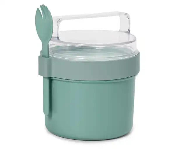 To-Go-Behälter Farbe: Oberer Behälter transparent Unterer Behälter und Löffel salbeigrün Material: Behälter und Löffel 100% Polypropylen Deckel 100% Styrol-Acrylnitril Dichtung 100% Silikon Maße: Höhe ca. 15,7 cm Ø ca.13,1 cm Länge Löffel ca. 14,5 cm Inhalt: Inkl. Löffels Gebrauchsanweisung: Nicht für den Gefrierschrank geeignet Nur der untere Behälter zum kurzen Erwärmen in der Mikrowelle geeignet Nur kalte Speisen für den oberen Behälter geeignet Warnhinweise: Heißen Inhalt nur in den unteren Behälter einfüllen Ideal für den Transport von SalatDeckel mit Tragegriff zum separaten Aufbewahren von z.B. Croutons oder KernenIntegrierter DressingbehälterInkl. Gabel-Löffel zum BefestigenSilikondichtung verhindert Auslaufen