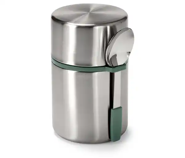 To-go-Thermobehälter Farbe: Edelstahlfarben mit dunkelgrünen Details Material: Behälter und Löffel Edelstahl 18/10 Deckel außen Edelstahl 18/10, innen Polypropylen Dichtung und Silikonhülle für die Gabel 100% Silikon Ring und Schlaufe Polypropylen Maße: Höhe ca. 14,5 cm, Ø ca. 9 cm Höhe ohne Deckel ca. 9 cm Löffel Länge ca. 13 cm, Breite Laffe ca. 4 cm Inhalt: Inkl. Gebrauchsanweisung Füllmenge: Ca. 400 ml Warnhinweise: ACHTUNG. Der Inhalt kann heiß sein! Inkl. Löffel mit Mini-GabelDoppelwandisolierung hält Speisen und Getränke länger warm oder kaltMit großer Öffnung zum einfachen BefüllenDeckel schließt auslaufsicher – ideal für unterwegsLöffel einfach am Behälter fixierbarMit Trageschlaufe