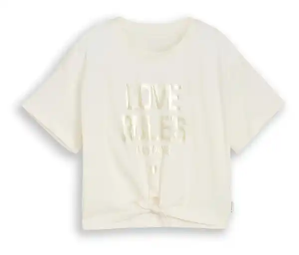 Tom Tailor Kinder-T-Shirt mit Print und Knotendetail, wool white Farbe: Wool white Material: 100% Baumwolle Maße: Gesamtlänge ca. 45 cm, Brustweite ca. 49 cm (Gr. 152) Kurzärmliges T-Shirt mit Schriftzug als Print auf der VorderseiteKnotendetail am SaumPassform: Cropped Fit ‒ verkürzte LängeRundhalsausschnitt KurzarmAus atmungsaktiver und weicher Baumwolle für ein angenehmes TragegefühlOhne Verschluss