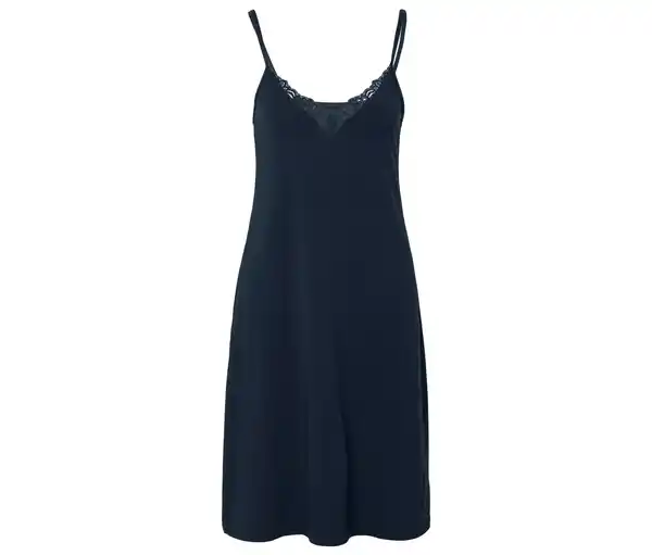 Trägernachthemd Farbe: Dunkelblau Material: 48% Baumwolle, 47% Modal, 5% Elasthan Spitze 88% Polyamid, 12% Elasthan Maße: Gesamtlänge ca. 75 cm (Gr. M 40/42) Passform: Slim Fit Leichtes Material aus Baumwolle und ModalV-Ausschnitt mit feiner SpitzeLängenverstellbare TrägerMit hochwertigem Markenelasthan für Langlebigkeit und hohe Waschbeständigkeit