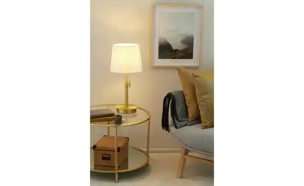 Details##### Trio Tischleuchte, 1-flammig, messing-matt, Stoffschirm weiß
