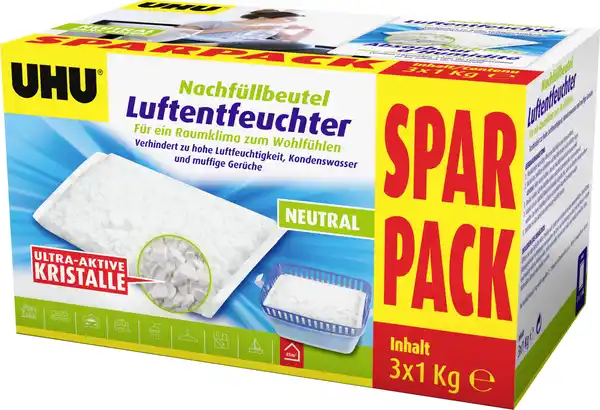 Nachfülleinheit für UHU Luftentfeuchter 1000g. Bekämpft Feuchtigkeit sowie muffige und modrige Gerüche. Der Luftentfeuchter arbeitet geruch- und geräuschlos, verbraucht keine Energie und ist einfach nachzufüllen. Der Luftentfeuchter reduziert eine zu hohe Luftfeuchtigkeit in geschlossenen Räumen mit wenig oder keiner Lüftung. Ideal für Keller, Garagen, Dachböden, Garderoben, Wohnwagen, Boote, Schuppen usw.Inhalt: 3 Nachfüllbeutel je 1000 gje für Räume bis 80 m³gegen Korrosion, Schimmel, Stockflecken und muffige GerücheNachfüllbeutel beutel mit ultra-aktiven KristallenHerstellerinformationen: UHU GmbH & Co.KG | Herrmannstraße 7 | 77815 Bühl, Deutschland | eMail: sds@boltonadhesives.com | Herstellernr. 47040Inhalt: 3 Nachfüllbeutel je 1000 gje für Räume bis 80 m³gegen Korrosion, Schimmel, Stockflecken und muffige GerücheNachfüllbeutel beutel mit ultra-aktiven
