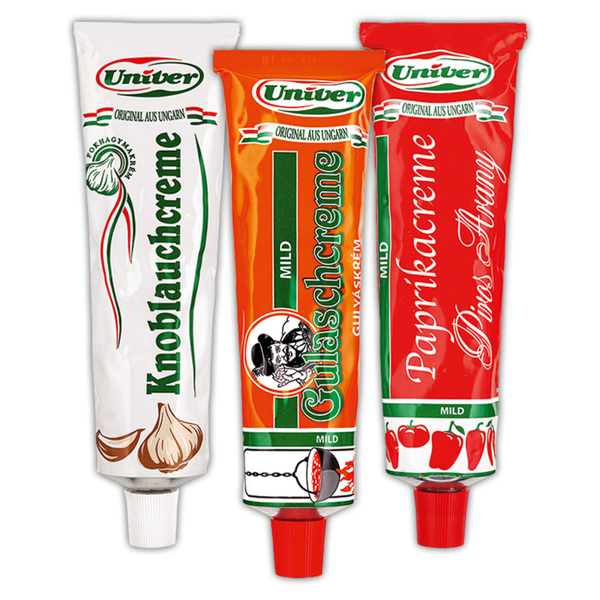 ### Delikatess Creme Ungarn – Zwiebel-, Knoblauch-, Paprika-, Gulaschcreme, Knoblauch-Chili-Gewürz-Creme, Zwiebel-Chili-Creme oder Paprikamark mild oder scharf 160-g-Tube (1 kg = 11,19) je Tube