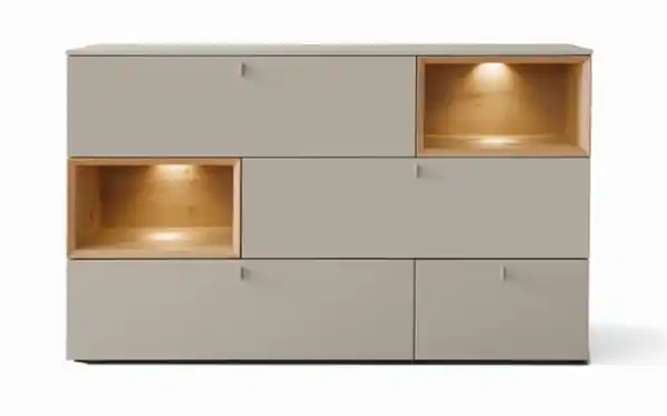 Ausführung der Front und Korpus in steingrau matt lackiert, Rückwand und 2 offene Dekofächer in Eiche rustico, hell, geölt, 4 Schubkästen,