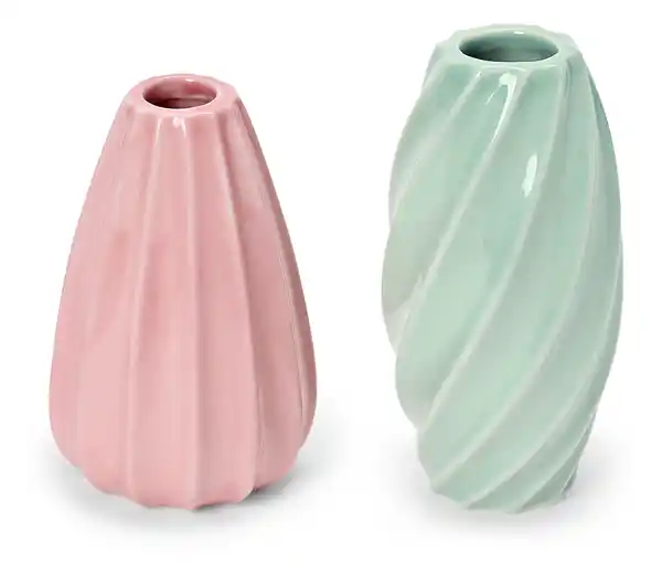 Vasen-Set Farbe: Klein rosa Groß salbei Material: Keramik Maße: Klein Höhe ca. 10 cm, Ø ca. 6,7 cm Groß Höhe ca. 12 cm, Ø ca. 6,2 cm Gewicht: Groß ca. 190 g Klein ca. 180 g Füllmenge: Groß ca. 150 ml Klein ca. 140 ml Modernes DesignIdeal für kleine Sträuße oder einzelne Blumen Aus Keramik
