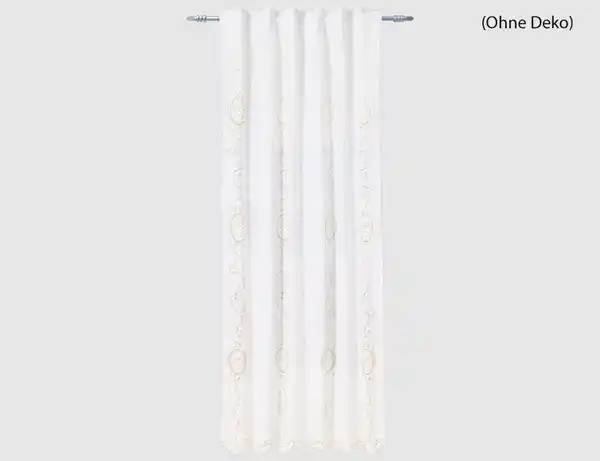 Verleihen Sie Ihrem Wohnraum ein exklusives Ambiente mit dem Schlaufenschal Sofia. Der feine weiße Fond bildet eine edle Grundlage für die kunstvolle goldene Ornamentstickerei, die jedem Raum einen Hauch orientalischer Eleganz verleiht.